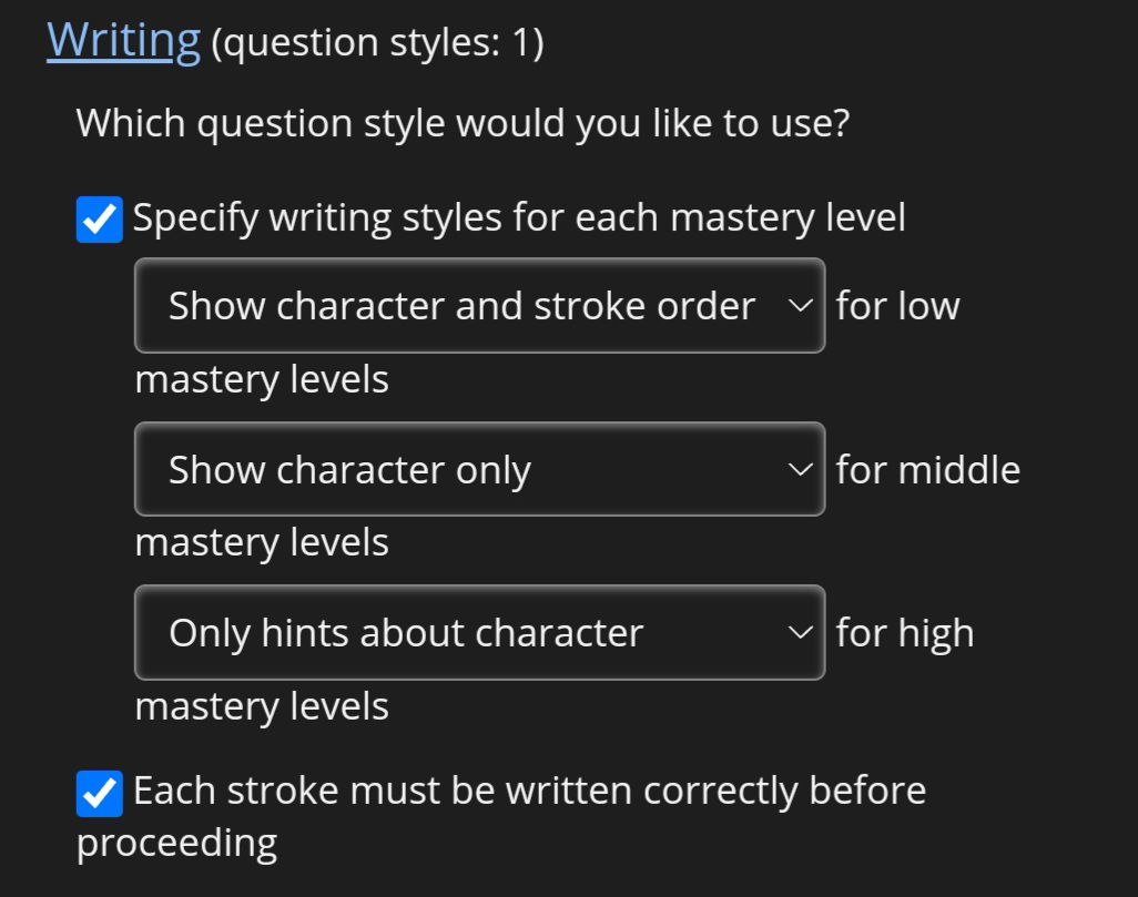 If it could be set like it is for kanji writing quizzing, so students could implement it when wanted, instead of happening automatically as it does now for vocabulary writing quizzing, then it could be optional for those who would want that challenge.