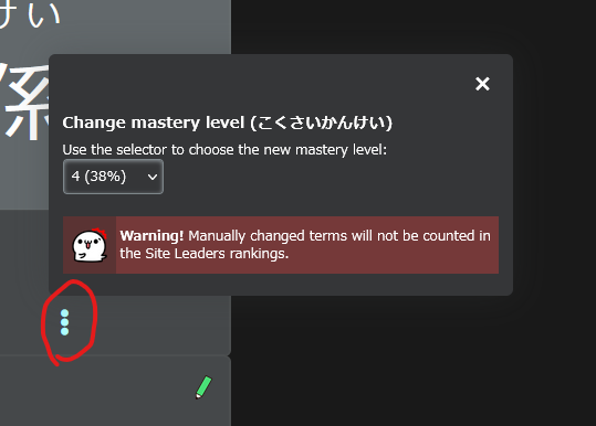 When I want to adjust the mastery of a word on PC, whenever I hover over the button in the red circle, the change mastery window automatically closes. This is resulting that the window often closes accidentally when I try to change the mastery and I have to go around the button with my mouse.