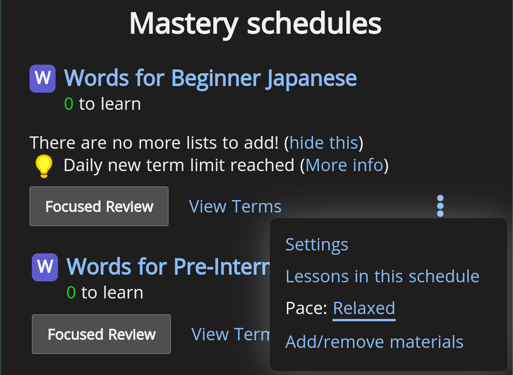 yes, there is! click on the three dots next to your schedual and change the setting to "relaxed". you can also set the amount of reviews to a number you choose...